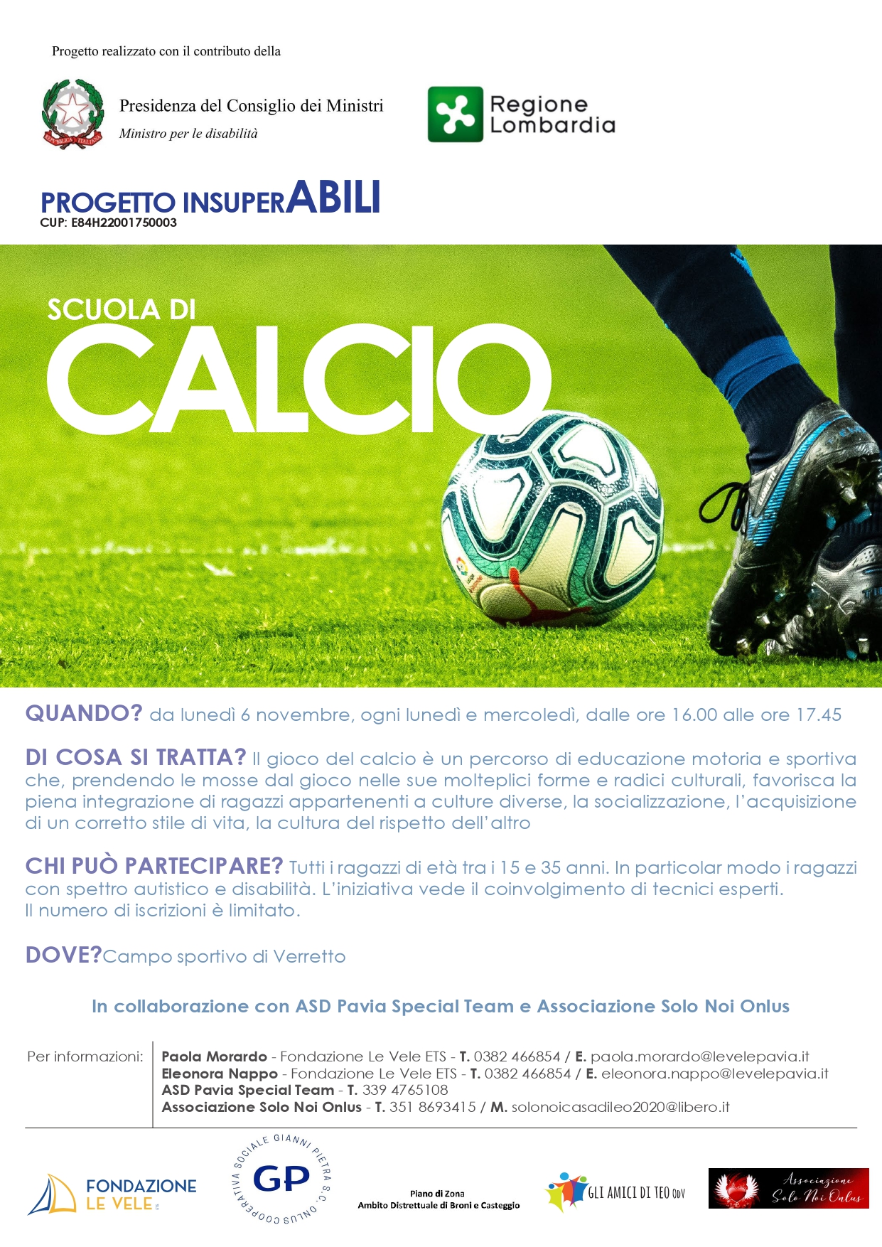 Al fine di informare tutti i possibili beneficiari del nostro territorio, in riferimento al progetto InsuperABILI - di cui il Piano di Zona è partner - si allega locandina relativa alla prossima attività in avvio presso il campo sportivo di Verretto.